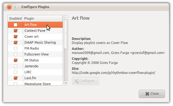 Open Rhythmbox and navigate to ‘edit > plugins’. In the plug-ins window check the ‘art flow’ bow to enable the feature.