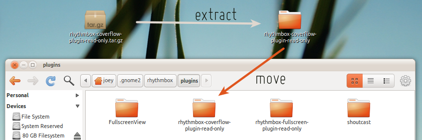 Now we need install the plug-in. Locate the ‘rhythmbox-coverflow-plugin-read-only’ folder (that you either pulled or extracted) and move it to the following location
