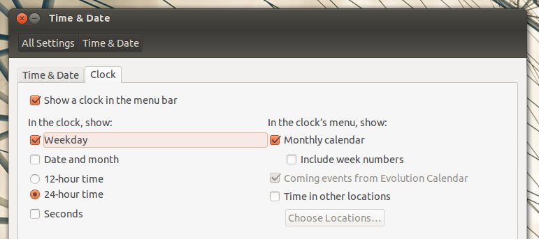 I find it handy to have the days date on show in the panel – simply because i’m forgetful. Ubuntu makes enabling a custom clock stanza on the panel a snap.