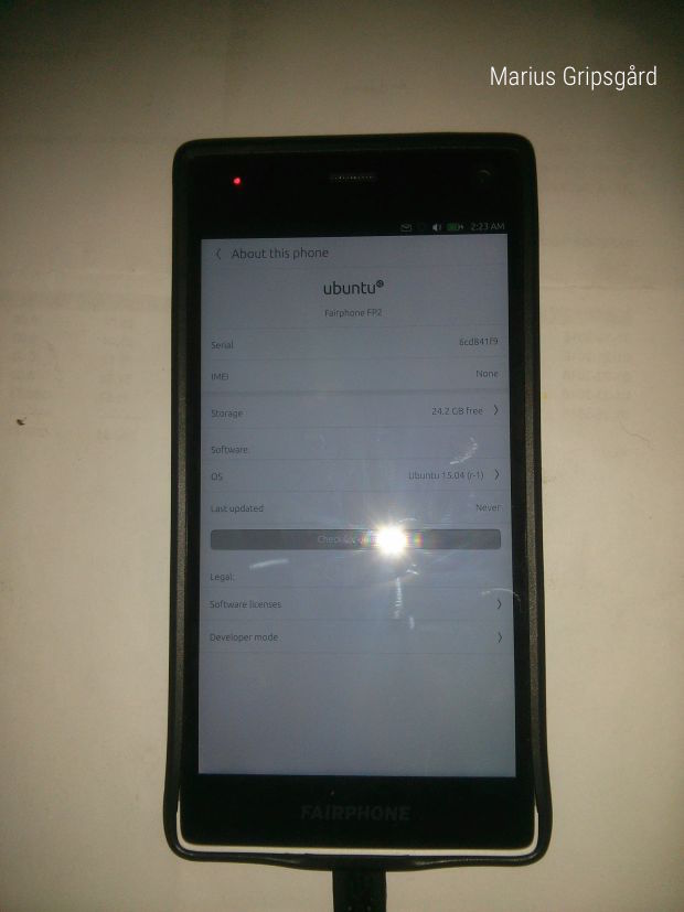 Ubuports’ Marius Gripsgård has shared a photograph (right) of Ubuntu running on his Fairphone 2.