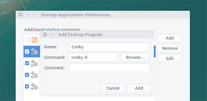 - Enter the name: ‘Conky‘; command: ‘conky -d‘