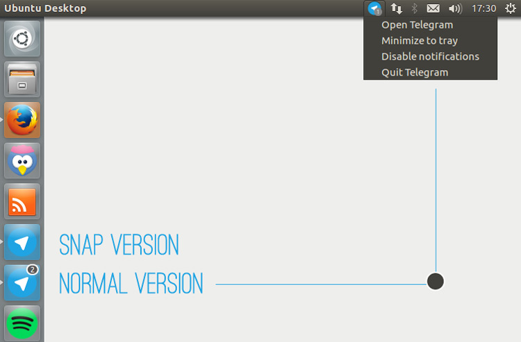At the time of writing are gaps in what Snap apps can and can’t do. The confinement currently means the Unity launcher can’t be ‘badged’ with a count for unread messages, and the indicator applet menu to quickly access the app doesn’t show.