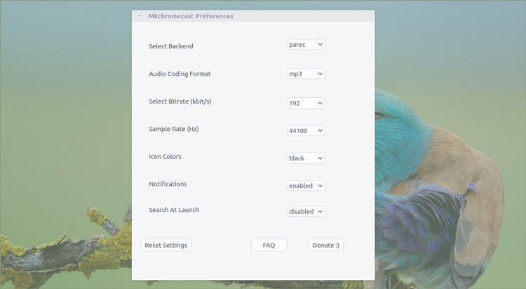 The open-source app (which is also available for macOS) streams Linux desktop audio to your Chromecast using either ffmpeg or parac, and a choice of audio format (including mp3) at a sample rate of 44100Hz and an average bitrate of 192k.