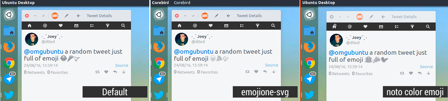 Here’s how an Emoji-stuffed tweet in GTK+ app Corebird looks out of the box, with emojione-svginot and with Noto color emoji: