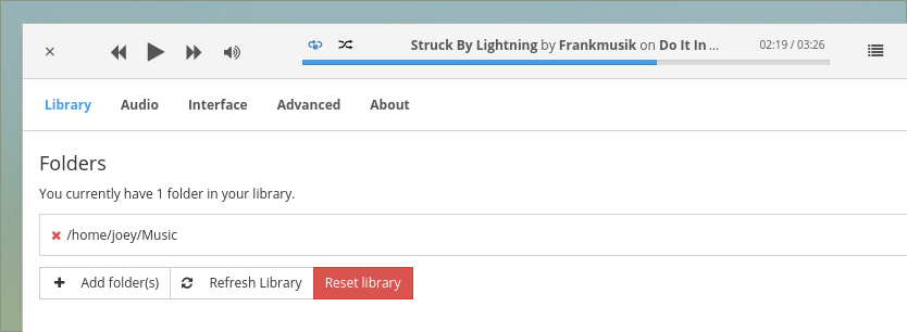 To add music click on the Settings icon and, under the Library section, click on “Add folder(s)” to add a music source (e.g., your ‘music’ folder).