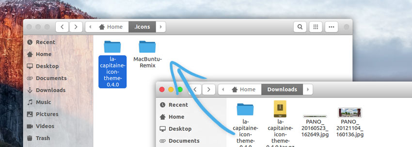 If you don’t see this folder press Ctrl + H to view hidden folders. Next, find the .icons folder or create it if it doesn’t exist. Move the extract folder mentioned above to this folder.