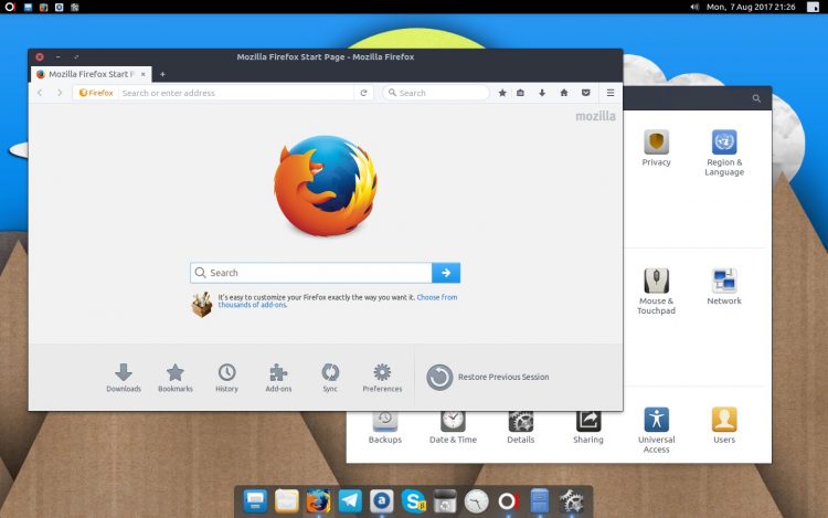 The desktop may take a little time to load fully. There’s no desktop dock application by default; task management and window switching is done done using icons on the top bar. I recommend using Plank with it.
