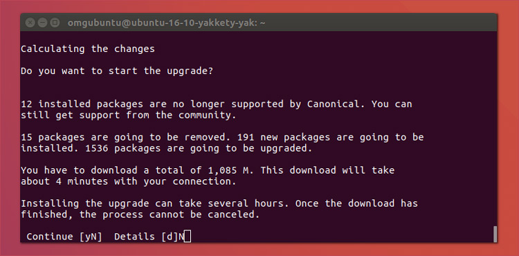 Pay close attention to all the information that appears in the terminal at this point. If you’re happy with what you see you can go ahead and okay the upgrade by pressing the Y key followed by enter/return.