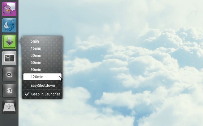 EasyShutDown lets you specify a time at which your computer will shutdown. You can either manually enter a time using the application window or, thanks to some slick Unity integration, right click on the application icon to choose a pre-set duration.