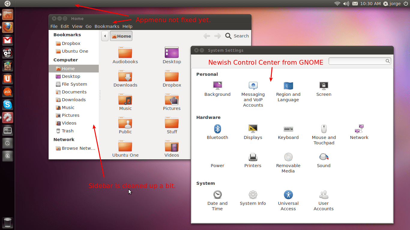 There’s actually a ton of work going on in Oneiric. By the time you read this Unity 4.0 should be hitting the archive (if not, the day after). This includes a port to GTK3 by Gord Allott, Neil Patel, and Bilal Akhtar. Neil also reorganized the source code a bit. And application indicators have also been ported to GTK3 by Michael Terry and others. This will be the platform that 11.10’s Unity will be built on, so it’s all been mostly boring-looking plumbing work that needed to get done. Here’s a picture of my desktop with some of the changes: