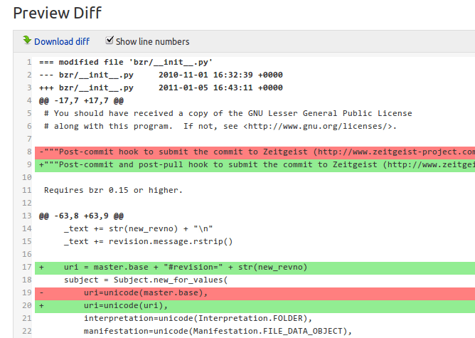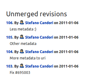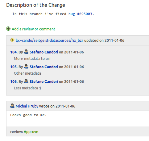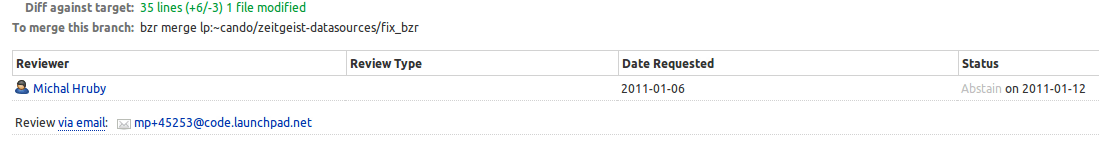 Now the maintainer of the project has to merge your branch. The maintainer first gets the latest branch contents by doing a bzr pull in the already existing branch on the disk or a bzr branch lp:zeitgeist in case the owner does not have the code with him/her at the moment.