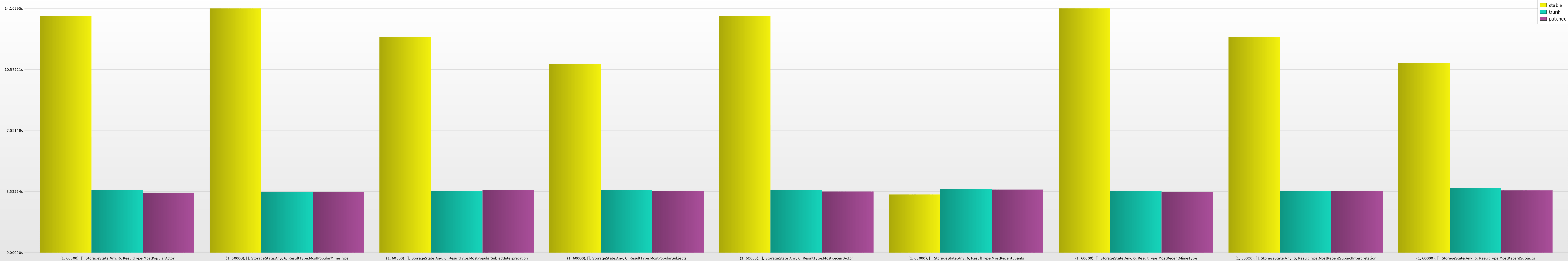We benchmarked the some typical Zeitgeist queries and plotted them on a graph. Yellow is current release, blue was some state before we updated the latest code to what we have now, which is denoted in purple. Shorter bars means less time needed for querying.