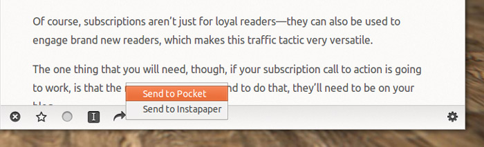 Clicking the second of these – the arrow icon – allows you to quickly ‘send’ an article to either service Pocket or Instapaper.