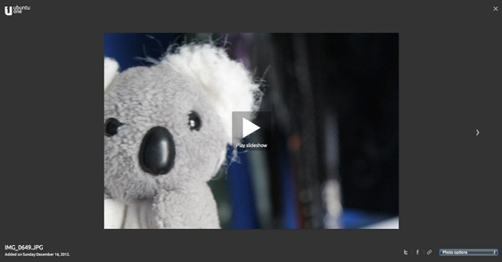 You’ll need an Ubuntu One account (free to sign up, don’t forget) with some images pre-uploaded. Then login, and hit the ‘Photos’ tab in the navigation bar.