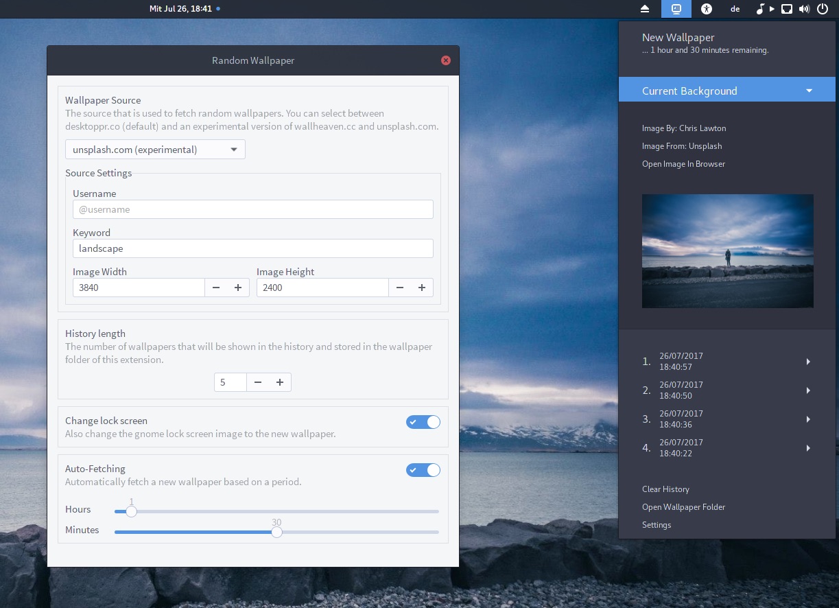 Helpfully, the extension keeps a small history of recently detached wallpapers so that you can re-set a particular favourite again, with ease. You can configure the length of this history through the extension’s setting. It’s here that you’ll also find ‘auto fetch’ settings.