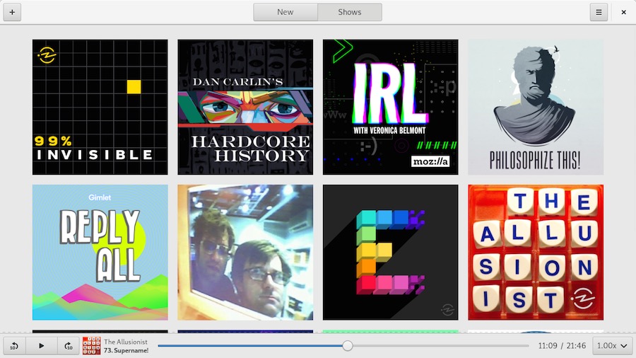 Podcasts has a simple, straightforward UI inspired by the (oft forgotten) GNOME Music app. The “Shows” tab presents a immersive cover-art gallery for browsing your subscribed feeds by show title.